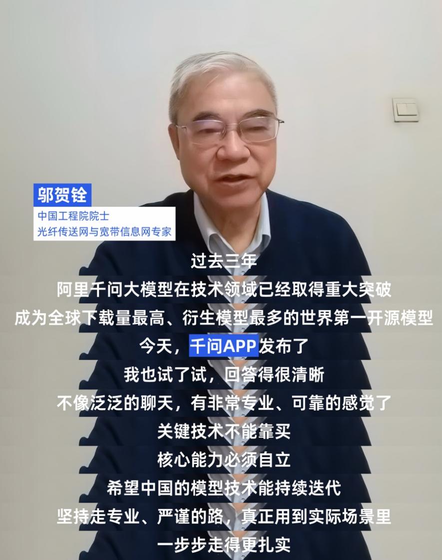在亲身体验后,邬贺铨院士对千问APP的专业能力给予了高度肯定,称其“对科研问题理解到位、回答专业,有耳目一新的感觉”。他希望中国的模型技术能够坚持走专业严谨的路线,持续迭代,并真正把模型能力应用到实际场景中去。